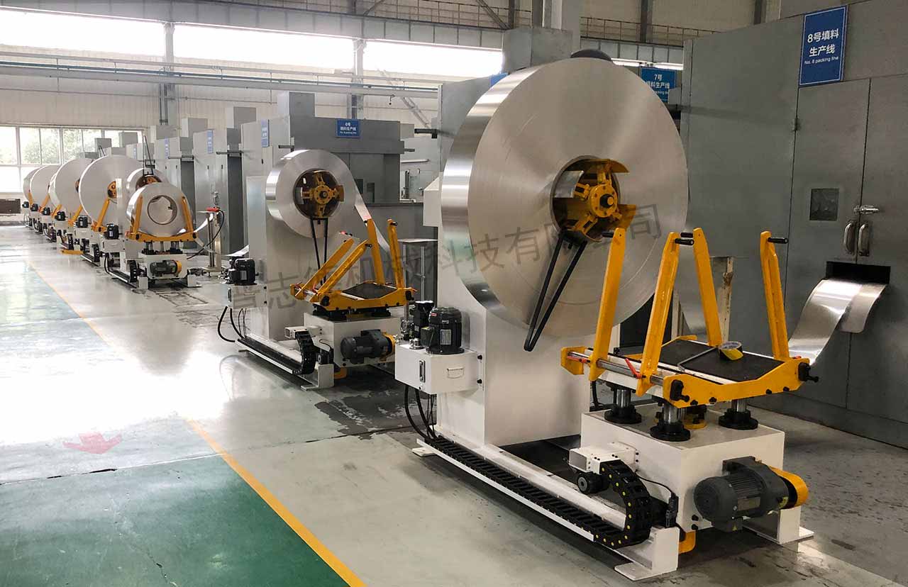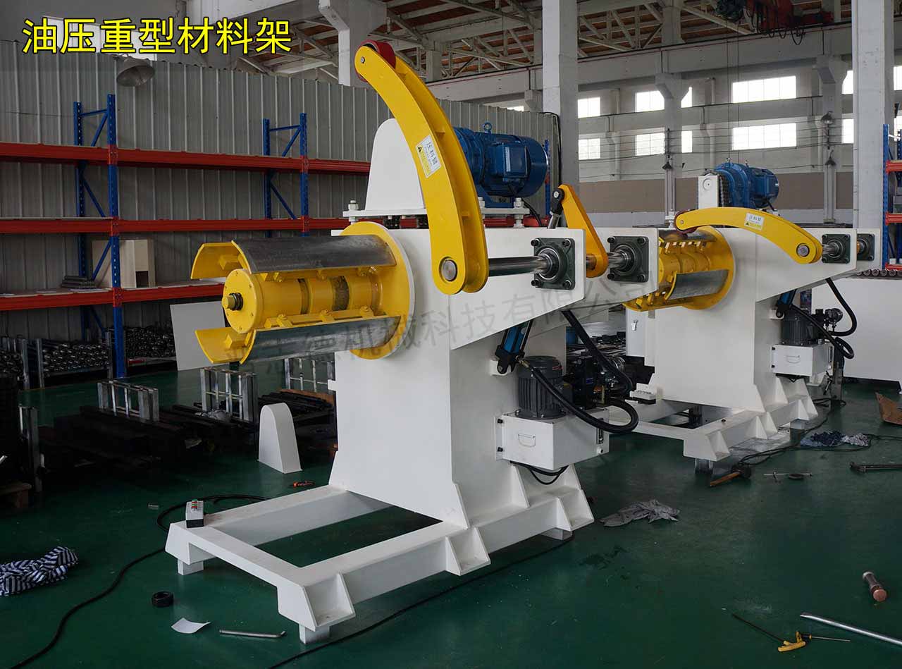 油壓重型材料架是專門針對(duì)寬料、重料而研發(fā)制造的機(jī)型,其將標(biāo)準(zhǔn)型重型材料架的手搖漲縮方式改為油壓漲縮方式,剎車由普通剎車改為分離式碟剎,同時(shí)變頻器、壓料臂的添加,以及主軸、機(jī)體的加固,使得油壓重型材料架能夠用于大型寬料、大噸位重料的放料與開卷,目前晉志德油壓重型材料架載重量可訂制20噸,料寬可訂制1800毫米。